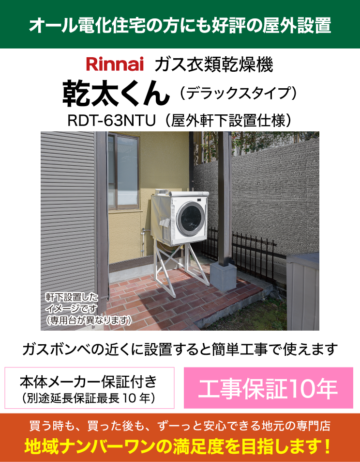 最近オール電化住宅にお住まいのお客様からもお問い合わせいただいております、ガス衣類乾燥機専用プランをご検討のお客様に好評の、「乾太くん屋外軒下設置セット」を追加しました。